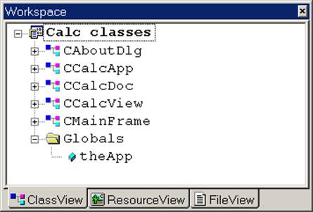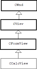 The CCalcView class is derived from the CFormView, which is derived from CView, which is ultimately derived from CWnd, the class of all windows (MFC class icons are shown in boldface):