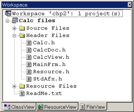 The [Workspace]/[File View] tree control shows all of the files that belong to the project. These are divided into source (.cpp), header (.h), and resource files: