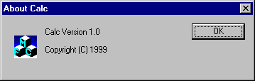 This is our application's message dispatcher. There will also only be a single instance of the CMainFrame class, which represents the frame around the application window that contains the form, menu bar, toolbar, and status bar. We'll delay any discussion of CCalcDoc objects until we start using them in Chapter 3. Each time we select [Help]/[About Calc ...] from the application menu an instance of the CAboutDlg class is created representing the [About Calc] dialog box that appears: