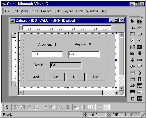 Instead of adding CEdit member variables to the CCalcView class representing the ARG1, ARG2, and RESULT edit controls, we can simply add three member variables m_arg1, m_arg2, and m_result representing the current states of the corresponding controls. And instead of adding CButton member variables to the CCalcView class representing the ADD, MUL, SUB, and DIV buttons, we can simply add member functions OnAdd(), OnMul(), OnSub(), and OnDiv() which are automatically called when the corresponding buttons send their BN_CLICKED messages.