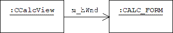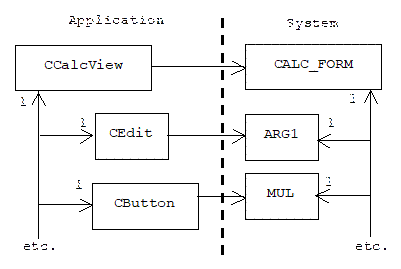 Now we know how CALC_FORM and CCalcView are related, but how are the buttons and edit boxes related to CCalcView? How are instances of the MUL, ADD, SUB, DIV, ARG1, ARG2, and RESULT system classes related to the CCalcView application class?