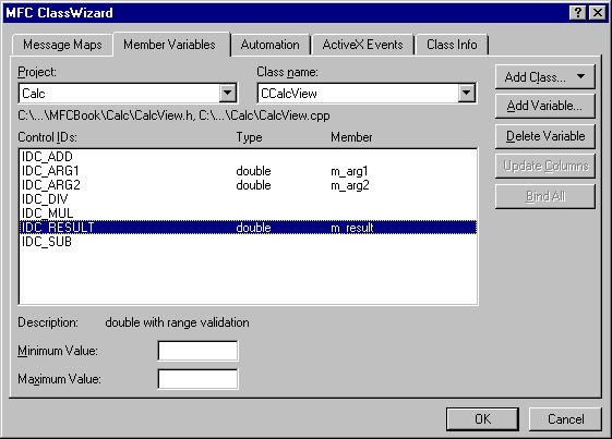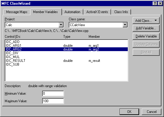 iv. Repeat this procedure for IDC_ARG2 and IDC_RESULT, calling the corresponding member variables "m_arg2" and "m_result".