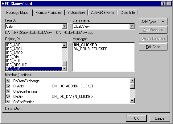 i. Select [View]/[ClassWizard]/[Member Variables]. Make sure "CCalcView" is displayed in the [Class name:] edit box.