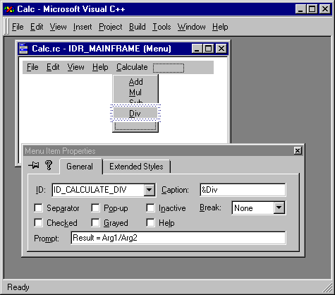 iii. Use the properties dialog of the edit controls to set their ID's to "IDC_ARG1", "IDC_ARG2", and "IDC_RESULT", respectively.