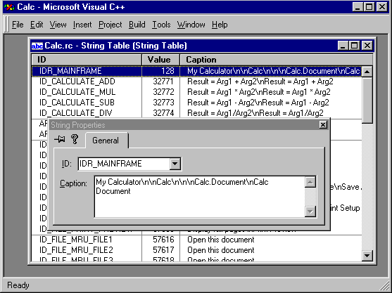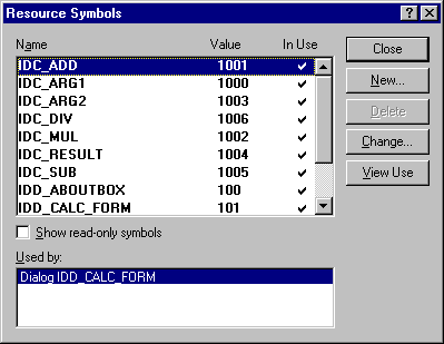 IDC_ADD, IDC_MUL, IDC_ARG1, etc. are called resource identifiers; they will be explained in detail below. Changing the names of the resource identifiers is not mandatory, but it will simplify things later on.