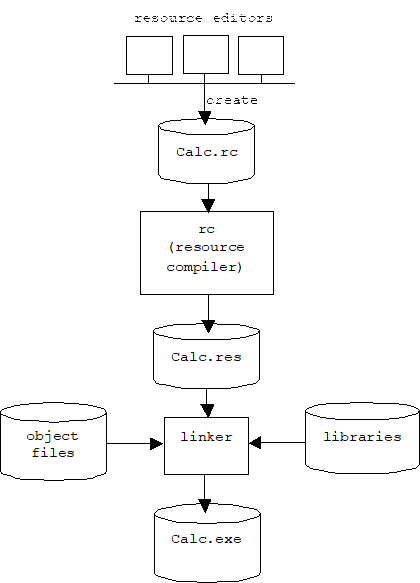 The [Workspace]/[Resource View] tree control shows the project's menus, toolbars, dialog boxes, and other resources. Double clicking on a resource automatically opens the resource file in a special graphical editor: