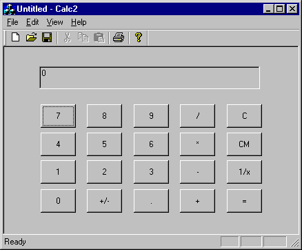 Ignoring the menu and toolbar for now, note that the calculator consists of three labeled edit boxes (one is read-only) and four buttons.