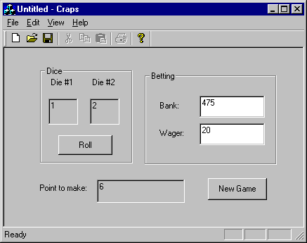 The [Dice] and [Betting] boxes are called "Group Boxes." As their name suggests, they can be used for grouping controls together. The [New Game] button sets the coming out flag back to TRUE. Of course the wager is deducted from the bank.