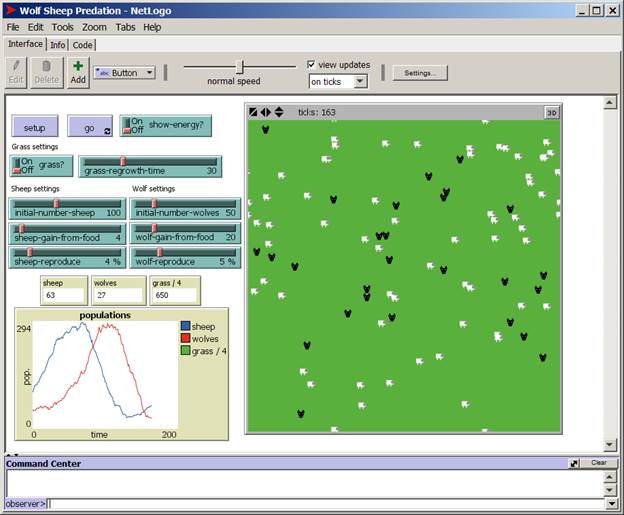 In a predator-prey model there are two breeds of turtles: wolves and sheep. As the sheep population rises, the wolf population rises. As the wolf population rises, the sheep population decreases. As the sheep population decreases, the wolf population decreases. As the wolf population decreases, the sheep population increases and the cycle repeats, creating a pattern of two sine waves, one behind the phase of the other: