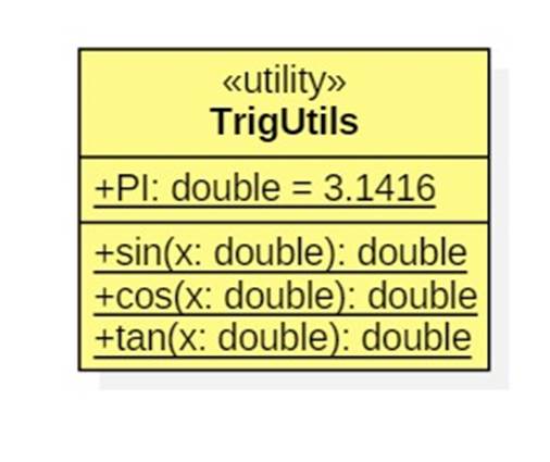 For example, a Trig utility class might contain sin and cos methods as well as the constant PI. There is no need to create objects to execute these methods.