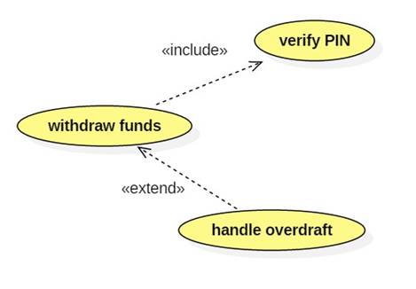 · The withdraw funds use case explicitly invokes the verify PIN use case before funds can be withdrawn. he withdraw funds use case implicitly invokes the handle overdraft use case if the customer attempts to withdraw too much.